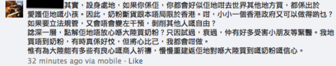出於道義,出於倫常,出於愛子之心,甚麼都好,作為香港人,當然不能坐視不理。可是,全民覺醒的時機尚未成熟,我們只能坐待東風,讓子彈繼續飛。任大陸人繼續猖狂地為非作歹,只是為了被宰窮的人,會在一朝驀然覺醒。覺醒,也就會團結,團結,才有跟大陸人決鬥的資格,因為以目前的香港人的思維和習性(注意,不是能力),與超級無敵打不死的大陸人打仗,我們是鬥不過的。回歸現實,如果香港家長真的對奶粉有需求,我強烈建議他們光顧水貨客。這一方面是一個解決燃眉之急的方法,另一方面可以曲線誘發港人對賣港者和大陸人更強烈的憎惡,有助刺激麻木者的神經,實上策也。