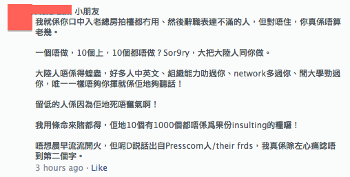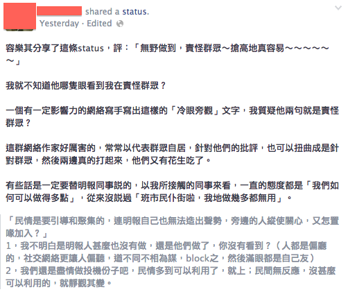 明報員工都是一群牛皮燈籠。他們以知識分子和社會良心自居,往胸口掛上一塊正義字牌,喊著堅守底線,以為只有自己站在刀口之上,視其他人都是局外人。他們將自己塑造成悲劇的主人公,雨果筆下的角色,當別人給予意見,好意批評之時,總是劈頭就嘲笑別人不是行內人,沒有自己一身傷痕纍纍的經歷也就沒有出聲的資格,然後關起耳朵,拒絕聆聽,擺出一副自有主意的姿勢,開始說起甚麼「子非魚焉知魚之樂」的排他起來。