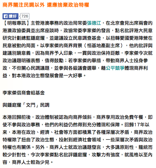 李家傑建議另起爐灶進行民調來抵制鍾庭耀,明報社評予以嘉許,認為「值得鼓勵」,這種角度是否客觀公正,是否貫徹明報俱收並蓄、待用無遺的風格,有眼皆知。而若明報不刊登這篇文章是否就會被讀者認為是一言堂,答案也自在人心,不必多贅。明報人「唔認為此評論有問題」,正視現實而無刻意護短,是正確得不能再更正確的回應。與明報人接觸得越頻密,我越能感覺到明報人的氣勢。他們猶如一群聚居於武當之巔的神功修煉者,其氣場直迫晚清期間挺身而出對抗外侮的民間組織義和團。