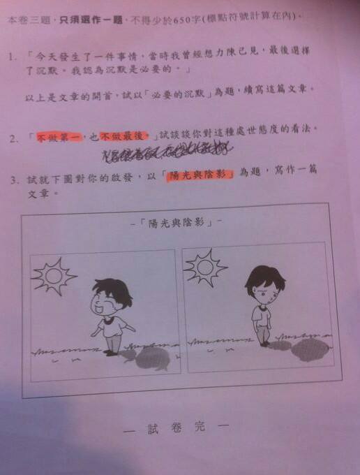 稍有文才的考生多死於公開考試之手,原因往往就是試卷設題過分偏狹,不合人情。觀今年三題,每一題的要旨都是談論做人處世態度,毋須描寫,不求抒情,只講說理。簡而言之,這份試卷就是跟有篩選的假普選一樣,驟看似提供了三種題目,實際上卻是偏狹得只有一種題目,考生只可以在爛蘋果中挑比較不爛的一個。考試設題落此,學校先生自然訓練學生如此寫字,那寫出來的文字又怎會有情有理,耐看風趣?這種讀書方法,比讀完一部注釋欠奉的《世說新語》還要痛苦。香港小朋友討厭寫字,討厭中文,都是香港教育制度害的。而「必要的沉默」這命題可不可以去政治化而又寫得好,答案當然是可以的,但獅陷牢籠,焉能舞爪?寫得再好,那也不外乎是一篇命題寫作範文而已。
