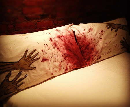 一扇朦朧的背影,在全身鏡前,打量著高大的自己。另一扇同樣朦朧的背影,從後抱著鏡中人,四目變八目的交投——忽然,鏡中人白皙的身體,鼓起了一個接一個的血泡,血泡流出膿血,膿血染了一地,一地都是絳紅的顏色。