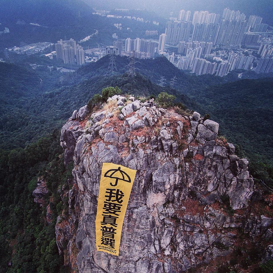 爭普選黃旗高掛於獅子山上,有人以文化研究的角度切入說,這能使人性原始的一面,即是對權力崇拜的傾向暴露,因為他們崇拜體積和高度,越龐大的文宣,就越能向他們展示權力和控制力。
