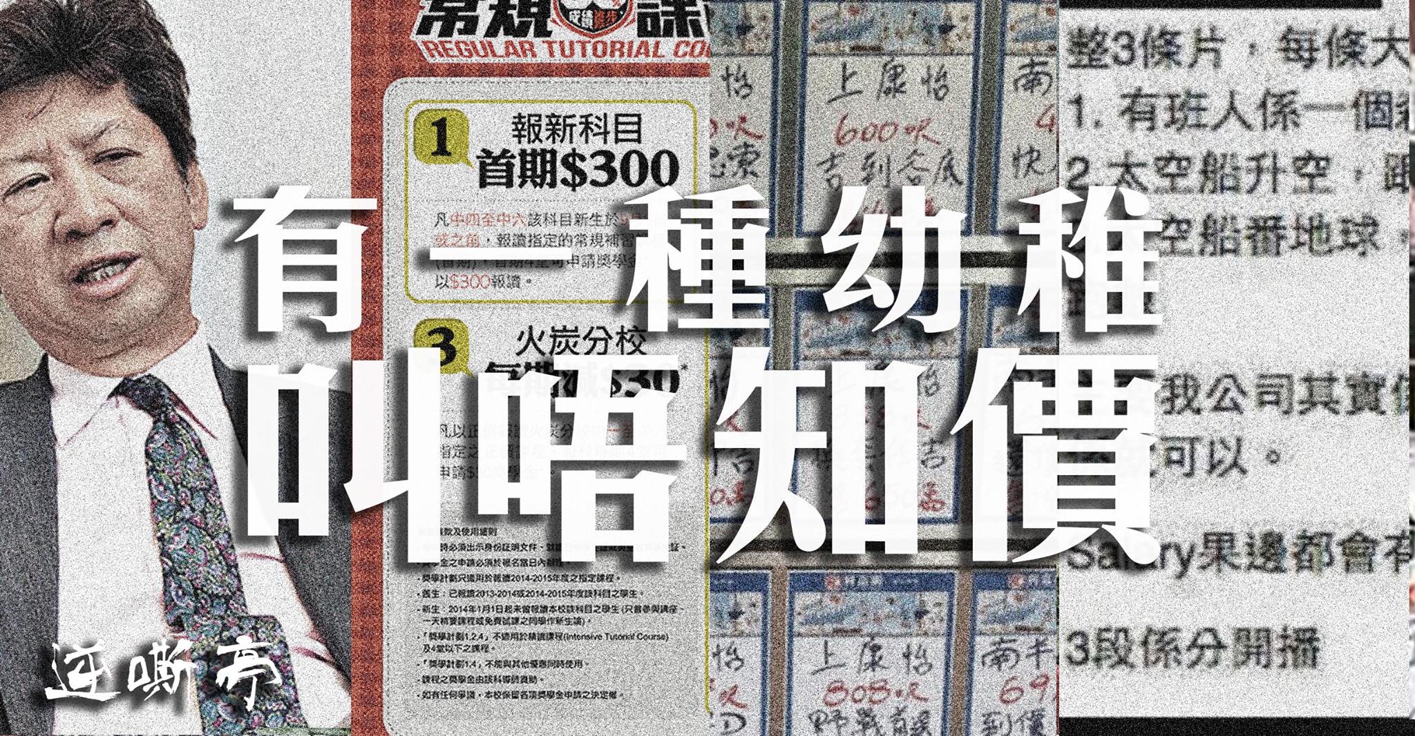 記得某次有人問價,他拋下過一句「基層學生有冇得平」,我當時的回應好像是「基層老師有冇得收正價?」,毫無同情,而且回想也不覺得自己有錯。手上得一塊麵包,臨危還要助人,不是我的風格。況且孔子標榜有教無類,也要收兩條臘肉。自己身為基層,而又身處於香港,應當抱有早已輸在起跑線,以及在自由市場裡頭,一切價高者得的覺悟。想要廉價的資助,沒問題,大可以到圖書館試試無師自通,或是去找政府跟偽善的NGO伸出所謂援手,但既是廉價,就得接受它照亮不了險窄的前路。求價廉而物美,除了向社會核心價值抽插,別無他法。始終,這個社會旨在產出面目模糊,人云亦云的「棟樑」,輕視普及教育,政府也不為香港人未來籌謀,基層是必須死的。
