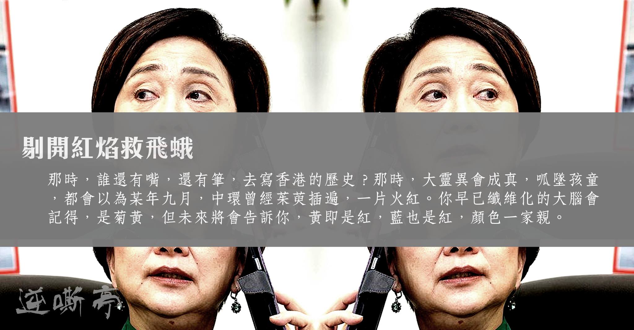 無病呻吟,都只因為心怯。我怕十年過去,沒了雨傘革命,更不消提香港曾經重光。我怕青年心雄而志不堅,甘心讓座,甘心退下火線。那時,誰還有嘴,還有筆,去寫香港的歷史?那時,大靈異會成真,呱墜孩童,都會以為某年九月,中環曾經茱萸插遍,一片火紅。你早已纖維化的大腦會記得,是菊黃,但未來將會告訴你,黃即是紅,藍也是紅,顏色一家親。
