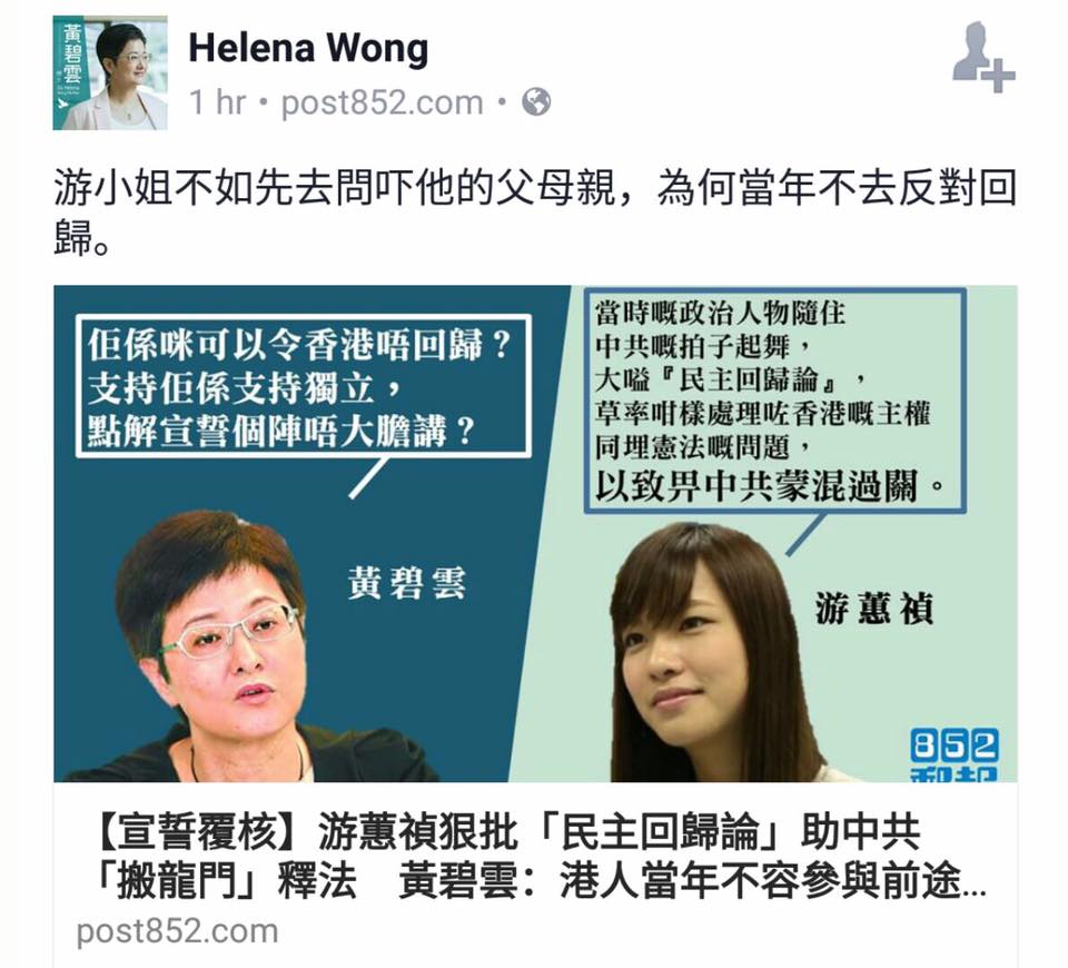 游蕙禎重提民主回歸論,黃碧雲竟以最在意料之中的答案回應,質問他人父母當年何以不去反對回歸,質素又見新低。難得的是,竟然又有人寫了一篇《又罵民主回歸——給你重頭再來又如何》,說到「在八十年代重頭再來,激流漂蕩的浪花中,梁頌恆與游蕙楨做到的,大概比不上一個馮煒光。問題不在能力,在時勢」,更認為梁游等人是以「今天的自造的尺,量度昨天得失」,為當年香港人,即包括黃碧雲等人在內辯護和開脫。