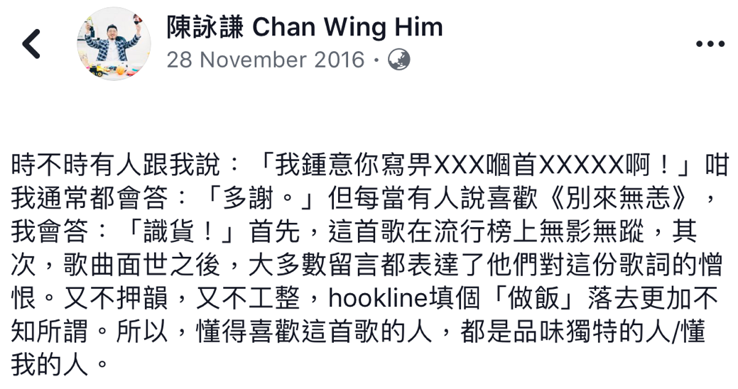 時間有限,每首只可以點評少少,但不知不覺,都寫咗六七個鐘。我試過填詞,知道填詞唔易,但自知之明,理應人皆有之。我相信大多數人都係不滿佢「我叻仔我可以肥」嘅招積,不滿蜀中無大將,而廖化竟自以為曹操。我個人偏好林夕,上文信手拈來例子大多以佢作品為主,希望大家體諒。最後衷心希望呢個寫得相當簡單嘅分析,算係勉強整理得到大家嘅見解,我知「殘忍只須一棍」同衛蘭都好恐怖,但考慮到其中問題同以上例子大體相似,在此不贅。辭多歉甚,如有補充賜正,歡迎切磋交流。